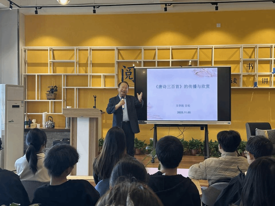 本网讯 11月5日,锦绣校区“阅+历”读书讲堂“人文十讲”第四讲由北京大学访问学者、中国词学研究会理事、我校文学院副院长甘松教授以“《唐诗三百首》的传播与欣赏”为主题,开展了一场兼具深度与温度的文化讲座。本次讲座由校阅读推广人、文学院教师齐晓坤主持。