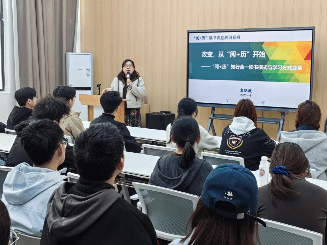 本网讯 4月1日下午,滨湖校区“阅+历”读书讲堂如期举行。本期讲堂特邀文学院教授、文学博士、省教学名师袁晓薇担任主讲嘉宾,以《改变,从“阅+历”开始——“阅+历”知行合一读书模式与学习方式变革》为题展开分享,外国语学院吴蓓老师担任主持,60余位选课学生到场聆听。