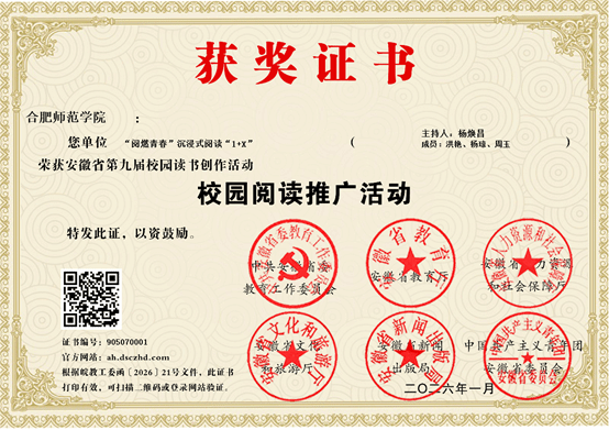 近日,由中共安徽省委教育工委、安徽省教育厅、安徽省人力资源和社会保障厅、安徽省文化和旅游厅、安徽省新闻出版局、共青团安徽省委员会联合举办的安徽省第九届校园读书创作活动评选正式揭晓。我校图书馆申报的“‘阅燃青春’沉浸式阅读‘1+X’”荣获"校园阅读推广活动"称号,文学院袁晓薇教授荣获"校园阅读推广人"称号。